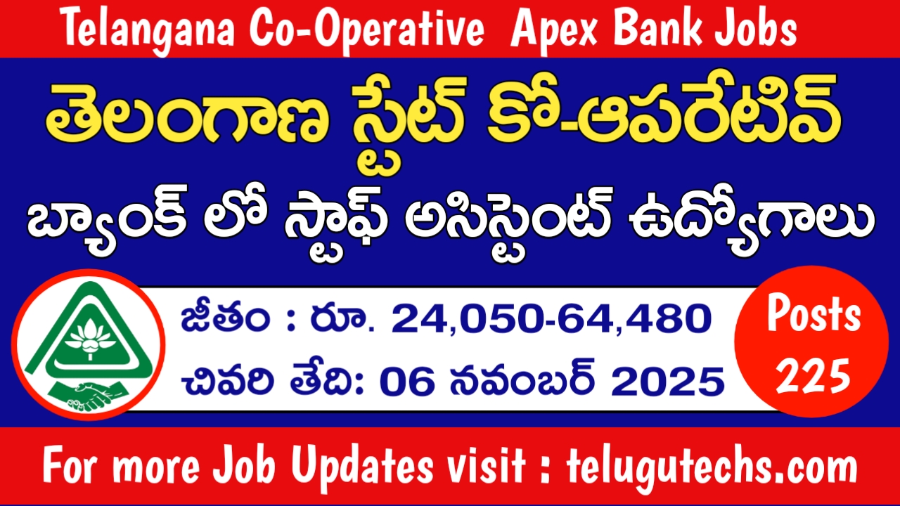 TS Apex Bank Recruitment 2025 లో 225 స్టాఫ్ అసిస్టెంట్ ఉద్యోగాలు. డిగ్రీ అర్హత, తెలుగు నైపుణ్యం అవసరం. ఆన్లైన్ లో దరఖాస్తు చేయండి. చివరి
